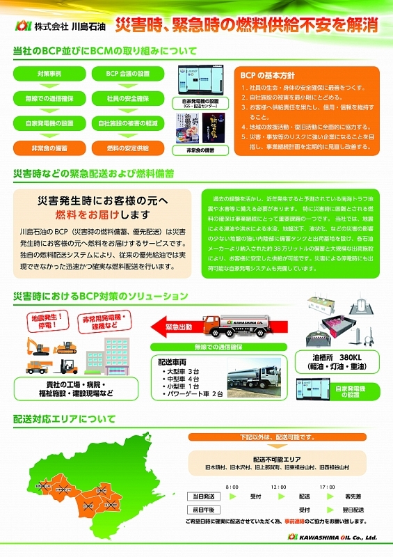 弊社では、建設現場、工場、病院、福祉施設、農業用ハウスなどへの軽油・灯油・重油の「パトロール給油」を燃料配送事業部と連携し、お客様のご指定の場所に、ご指定の時間に、安定供給する体制を整えております。お客様のご要望に沿った燃料配送事業を心掛けています。