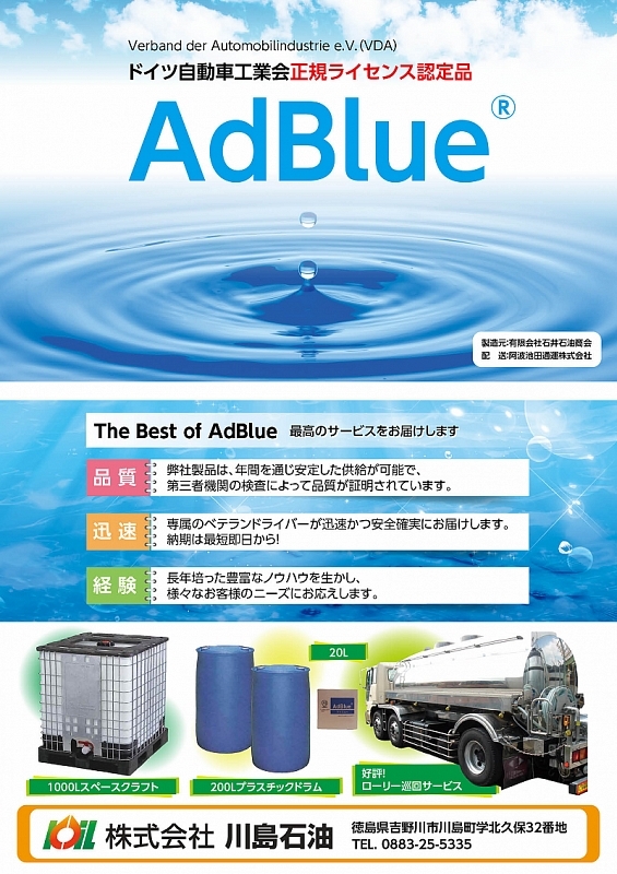 従来より取扱いしておりました「Ad Blue®(ドイツ自動車工業会正規ライセンス認定品)」の販売を、弊社サービスステーションでも取扱いをはじめました。詳しくは下記をご覧ください。
